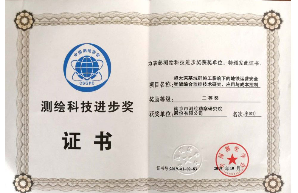 全国测绘科技进步二等奖——超大深基坑群施工影响下的地铁运营安全智能综合监控技术研究、应用与成本控制