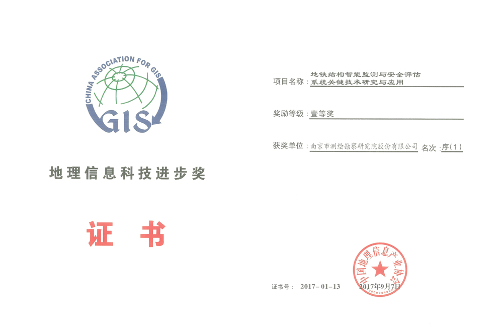 中国地理信息科技进步一等奖——地铁结构智能监测与安全评估系统关键技术研究与应用