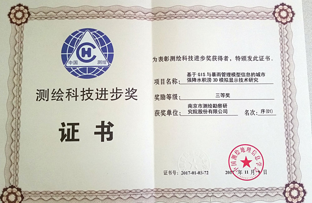 全国测绘科技进步三等奖——基于GIS与暴雨管理模型信息的城市强降水积涝3D模拟显示技术研究