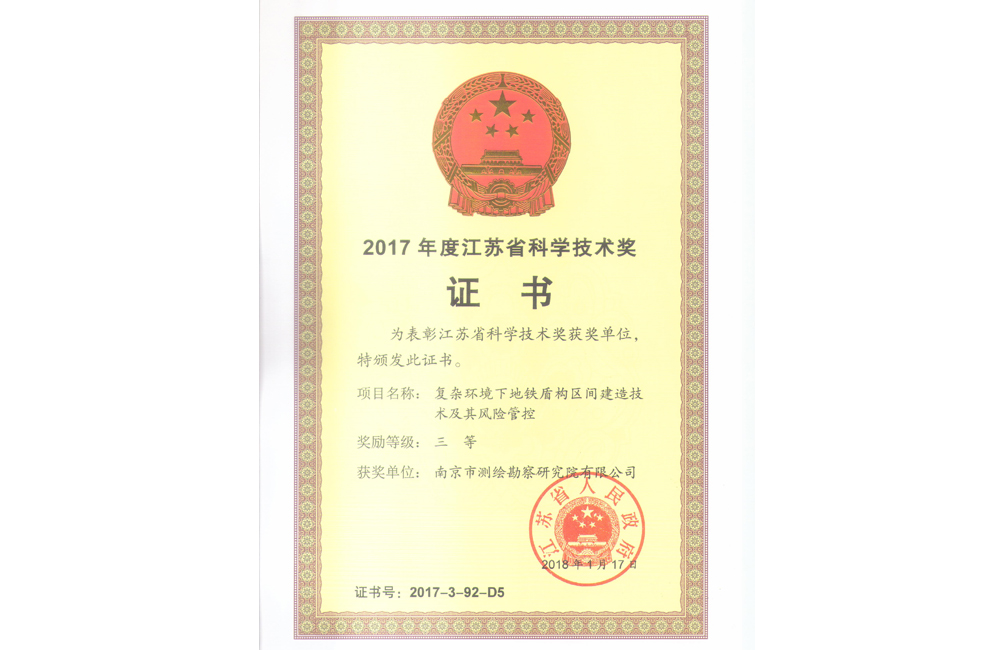 2017年度江苏省科学技术三等奖——复杂环境下地铁盾构区间建造技术及其风险管控